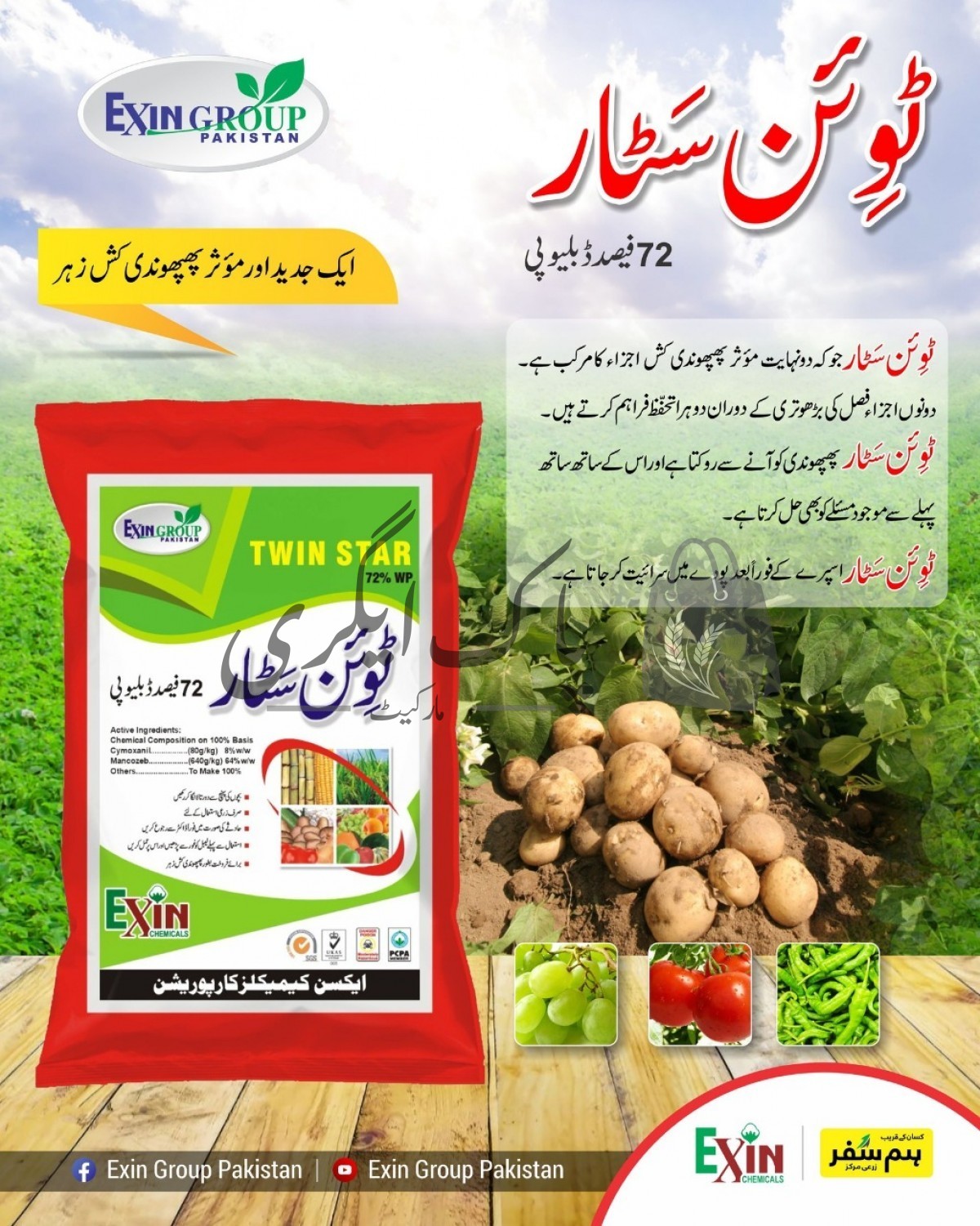 ٹوئن سٹار دونہایت مؤثر پھپھوندی کش اجزاء کا مرکب ہے ۔ دونوں اجزا فصل کی بڑھوتری کے دوران دوہرا تحفظ فراہم کرتے ہیں۔