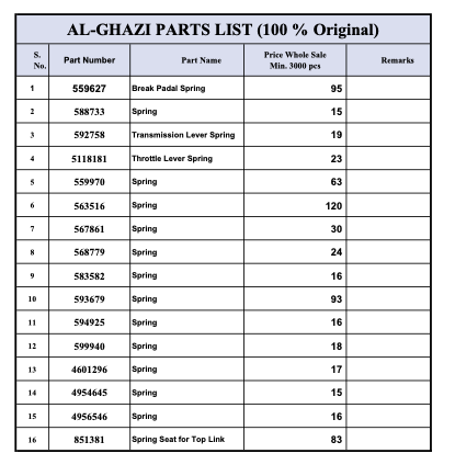 الغازی سپئیر پارٹس، پرزے